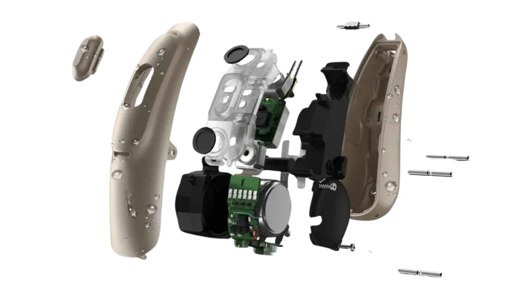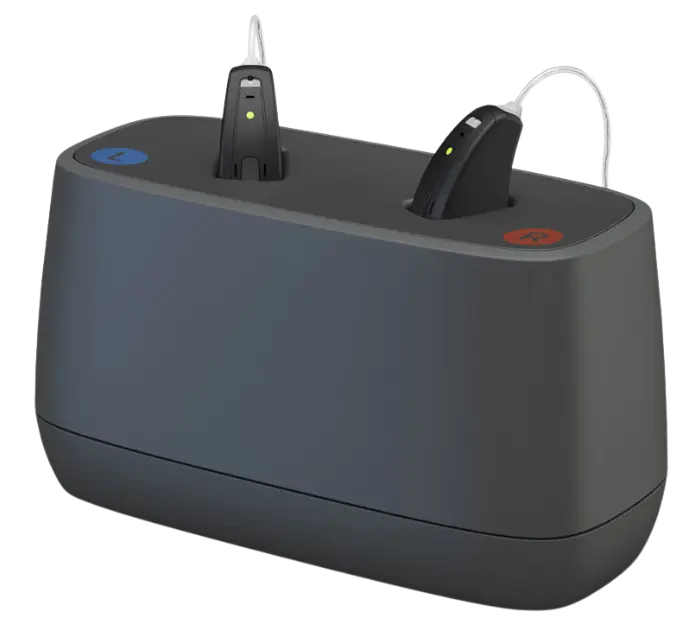 Un aparat auditiv reîncărcabil cu un receptor plasat în ureche (RIE) are o baterie litiu-ion încorporată care oferă până la 30 de ore de funcționare după o încărcare completă de trei ore.