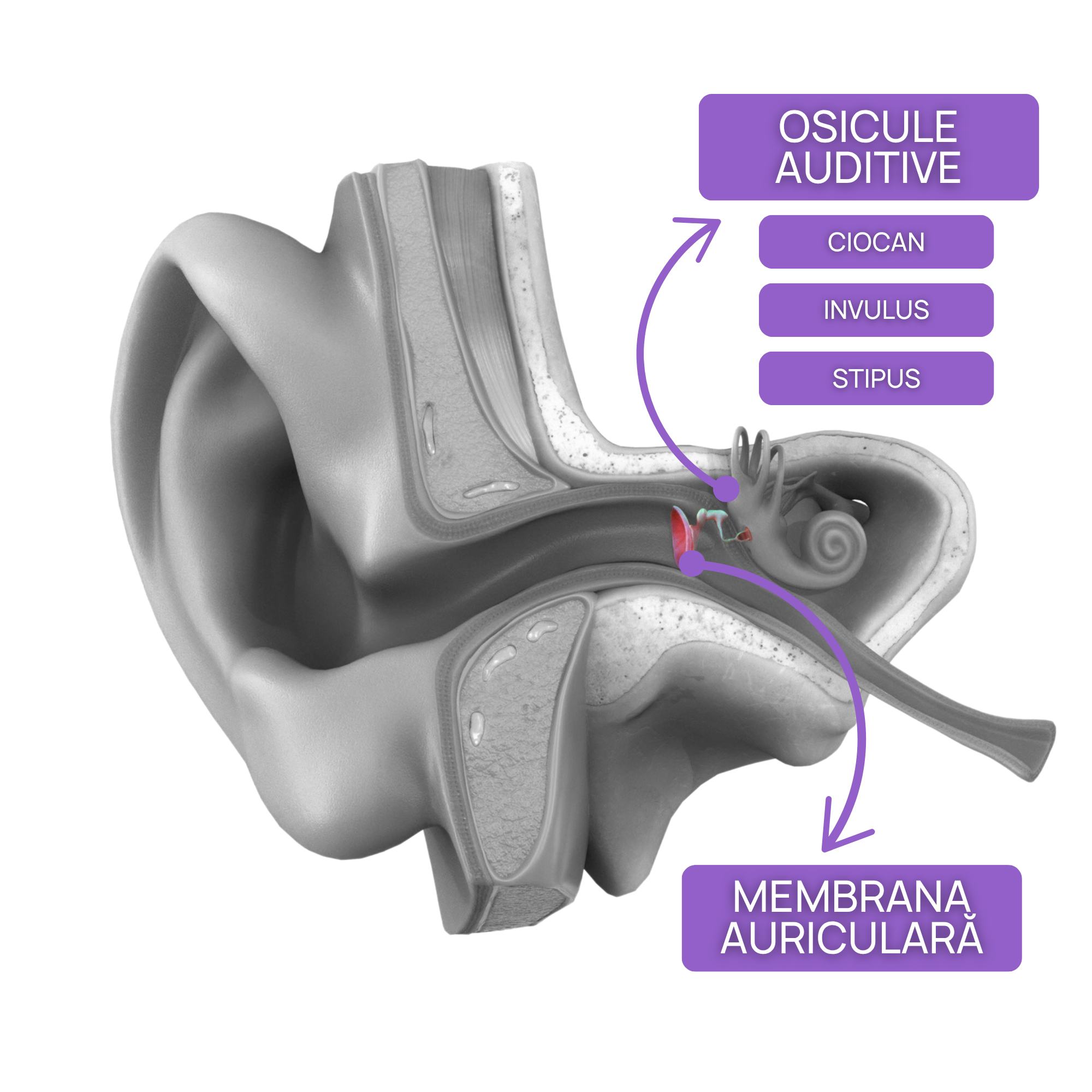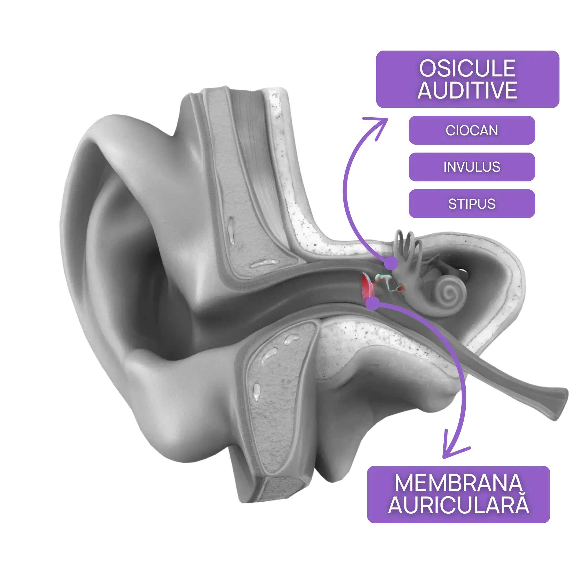 - Osicule: Trei oase mici (ciocanul, nicovala, scara) care transmit vibrațiile de la timpan la fereastra ovală a urechii interne. Aceste oase amplifică și transmit sunetul.