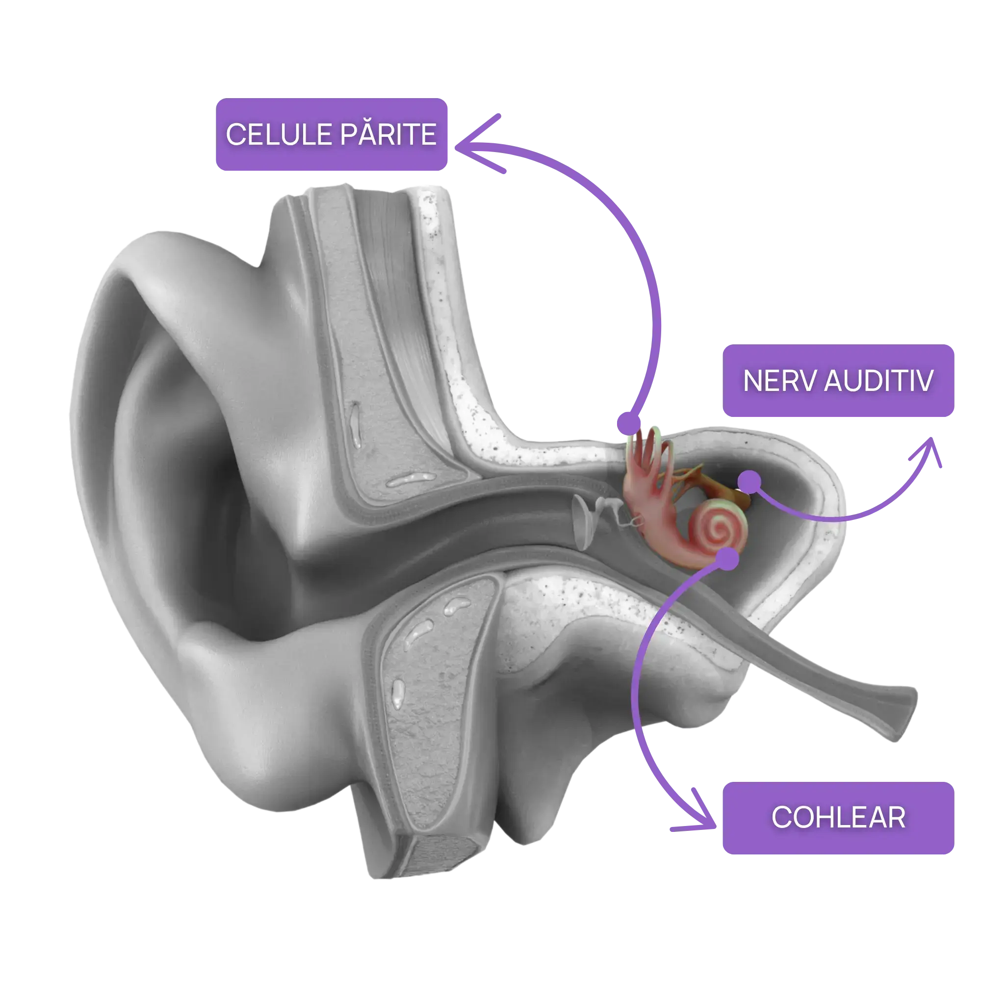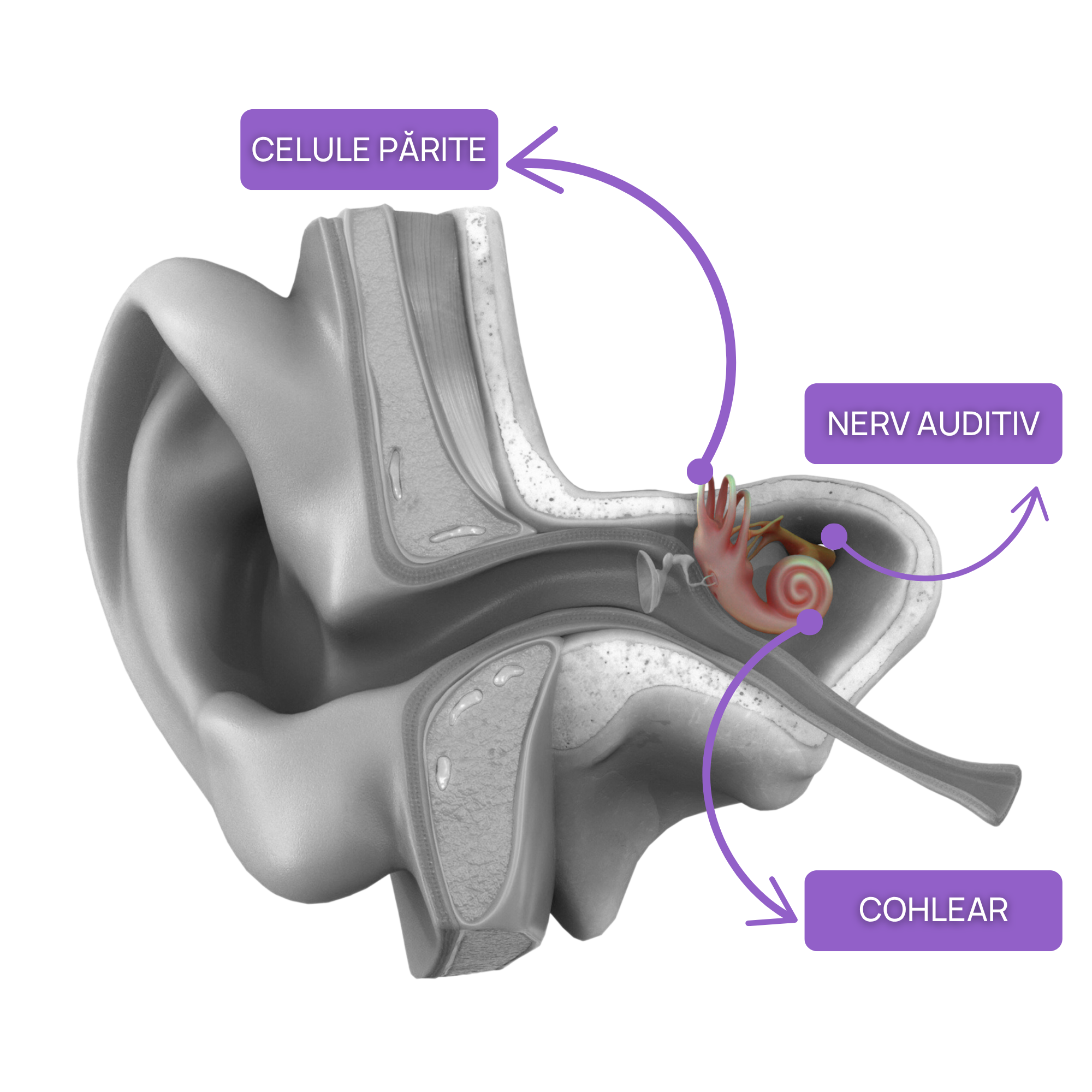 - Celulele ciliate: Transformă vibrațiile mecanice în impulsuri electrice, care sunt apoi trimise la creier prin intermediul nervului auditiv.