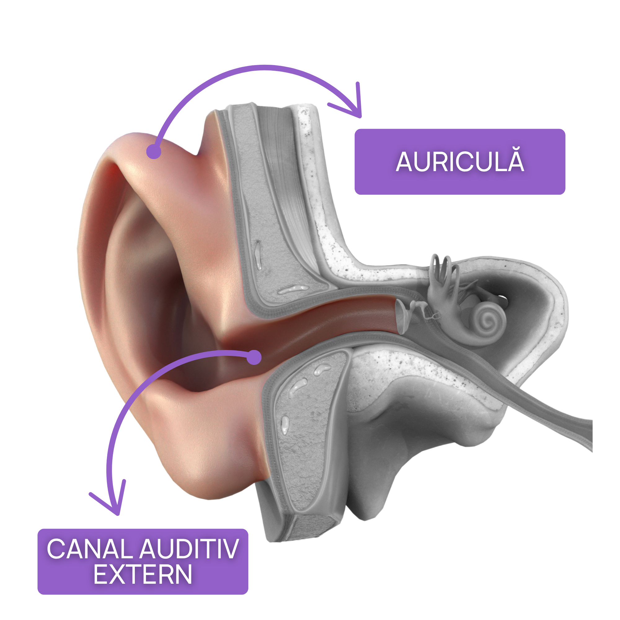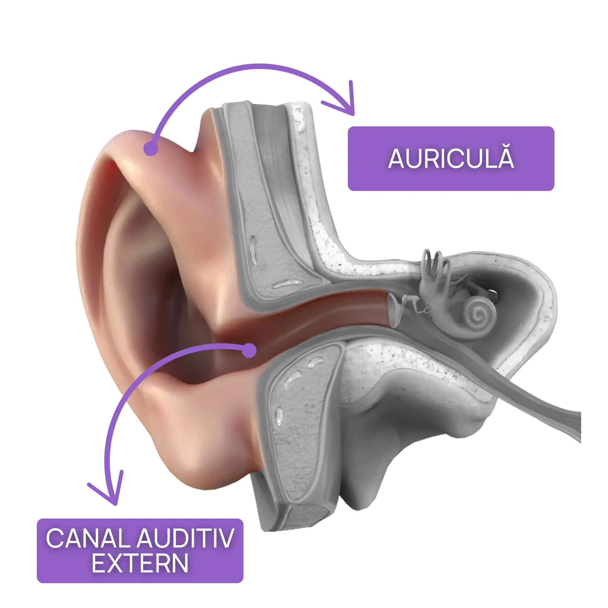 - Auriculă: Partea exterioară, vizibilă a urechii care colectează undele sonore și le direcționează către canalul auditiv extern.